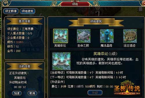 陪游《圣树传说》中的建筑分为英雄祭坛、生命之殿、魔法晶塔和远古遗迹四种。每种建筑的功能都是不同的,英雄祭坛是召唤英雄的建筑,英雄祭坛的等级越高,出现的英雄也就越多,刷新的时间也越短;生命之殿是将圣树之源转换成生命值的建筑,升级可以提高建筑的转化率和生命值储存上限;魔法晶塔是将圣树之源转换成魔法值的建筑,升级可以提高建筑的转化率和魔法值储存上限;远古遗迹是将圣树之源转换成生命值和魔法值的建筑,升级可以提高建筑的转化率和生命值、魔法值储存上限。