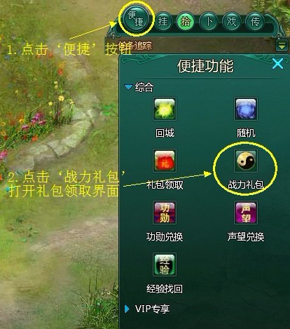 1、 点击‘便捷’—‘战力礼包’,打开礼包查看/领取界面;