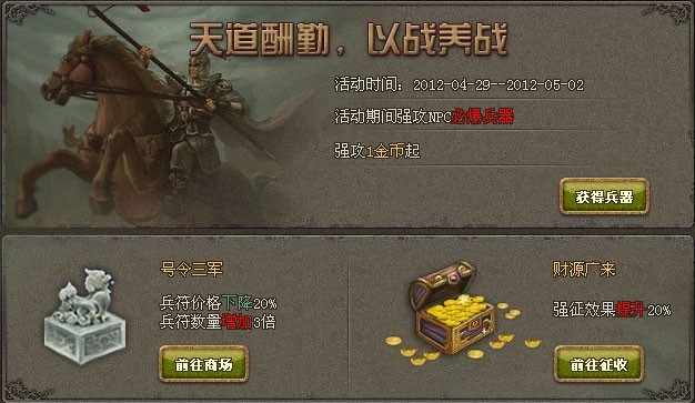 1、活动期间使用金币强征效果提升20% 。