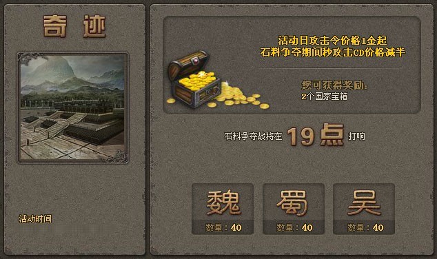 活动内容:活动期间新地区将在每天晚上的19点至23点开展奇迹资源争夺战,各国玩家通过战斗进行资源争夺,获取石料资源,争夺战结束后即可根据战果获取国家宝箱的奖励。
