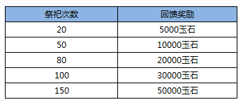 1.     祭祀送宝石:当天祭祀次数满150次。即可获得祭祀达人礼包,内含10000颗1级宝石